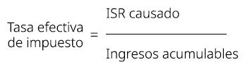 Tasa efectiva de impuesto: es aquella que se calcula con la información manifestada en la última declaración anual del ISR correspondiente al ejercicio fiscal en cuestión, mediante la división del monto del ISR causado en el ejercicio fiscal que corresponda, entre los ingresos acumulables de dicho ejercicio.